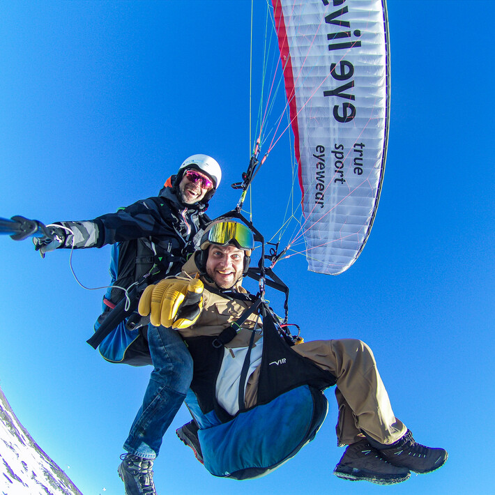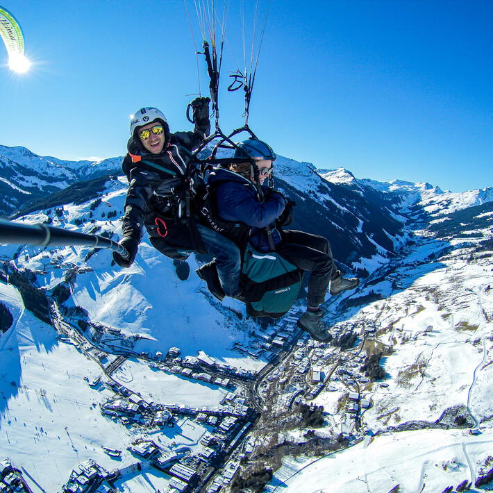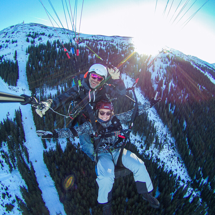 You can take off to Glemm Area and leave the daily routine behind. A rewarding and unforgettable view is waiting during a tandem paragliding flight. After arriving at the flying, the final preparations follow. We open the paragliding umbrella, adjust the harness and discuss start-up procedures. After some starting exercises and a final check by our qualified tandem pilot, it’s time to take off. You start running and watch as the ground disappears under your feet. Weightless and calm, you’ll glide over the valley. A unique feeling that only a paragliding flight can offer.